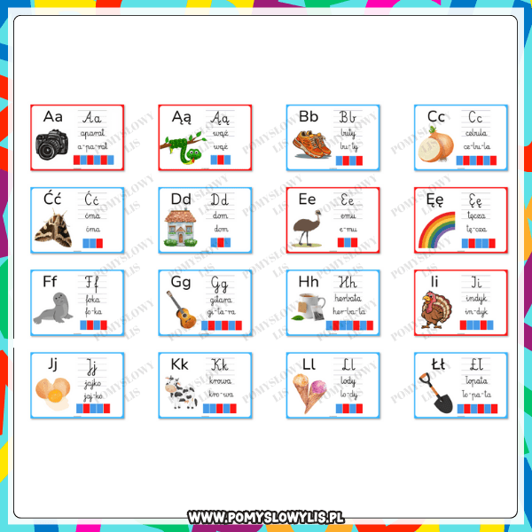 * podział wyrazu na sylaby - Samogłoski oznaczone na czerwono, spółgłoski na niebiesko – ułatwia analizę fonetyczną i naukę czytania.