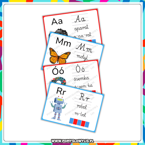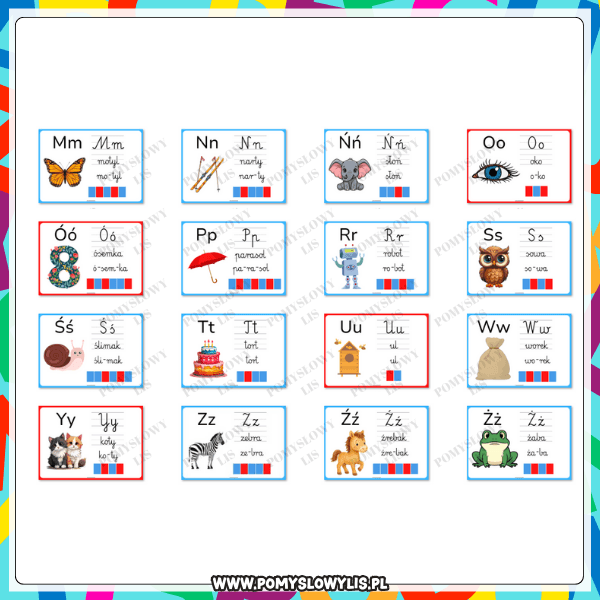 - Kompletny polski alfabet – Zestaw obejmuje wszystkie litery wraz z polskimi znakami: ą, ć, ę, ł, ń, ó, ś, ź, ż.